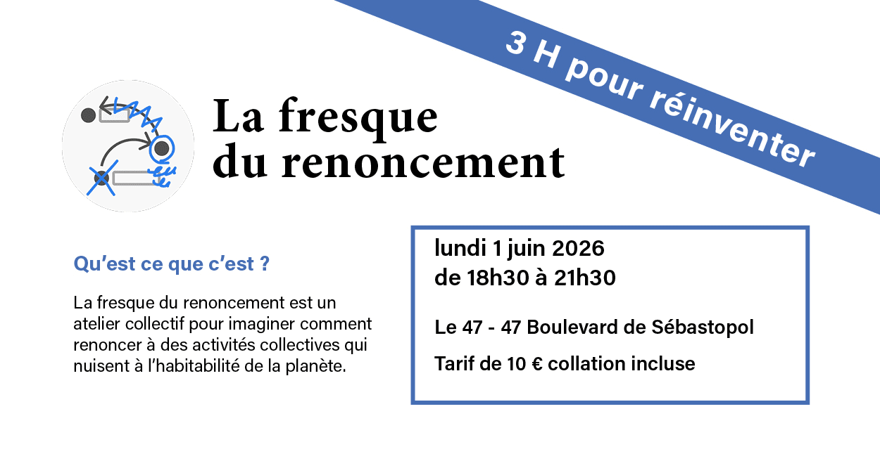 La fresque du renoncement est un atelier collectif pour imaginer comment renoncer à des activités qui nuisent à l’habitabilité de la planète. Il permet de décrire une activité de différentes manières, de découvrir la complexité d'un processus de renoncement et de concevoir une stratégie collective pour renoncer à l'activité ou certains de ses aspects.